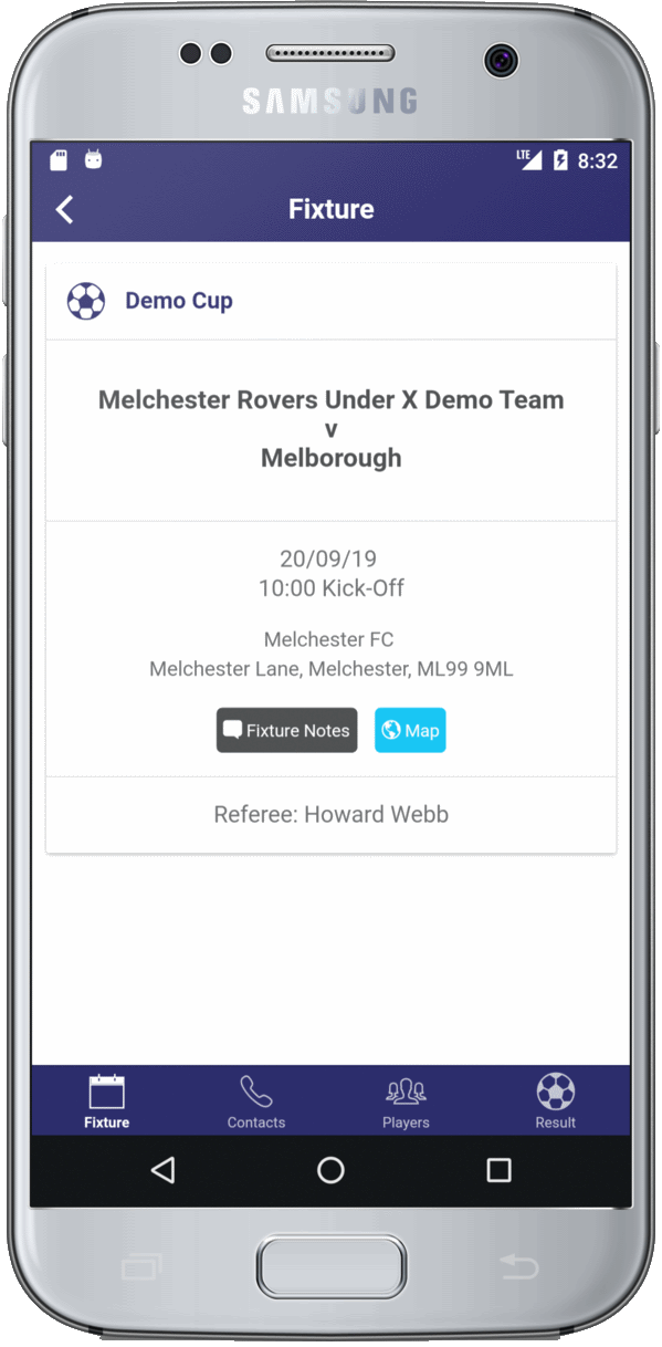 A row of tabs at the bottom take you through the various sections. The first tab – “Fixture” – shows the details of the game. Tap the black “Fixture Notes” button to see any notes entered by the home team for the fixture. Tap the “Map” button to see where the ground is.