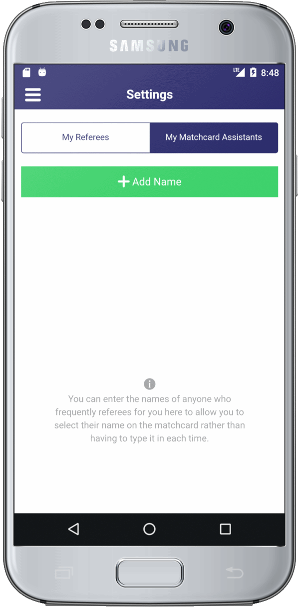 The “Settings” page lets you enter the name of anyone who either regularly referees for you, or who regularly helps with checking the opposition players registrations. Once entered on this page, their name will Appear in the list on the matchcard “Results” tab and you can simply select their name rather than having to type it in each time.